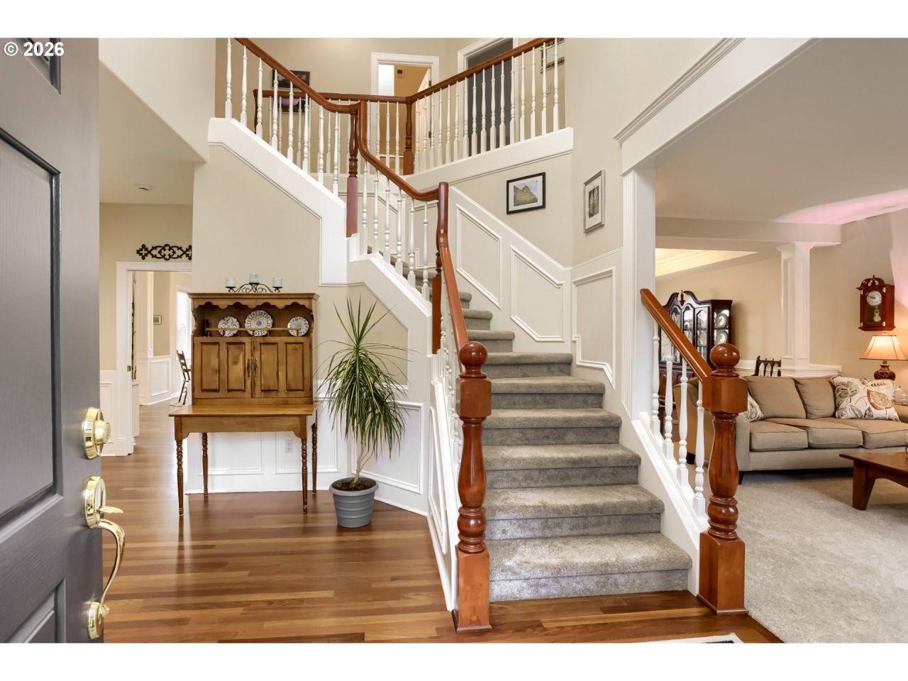 Big, solid home offering the best of space and quality with four bedrooms, den and bonus. All rooms are exceedingly large with great light and high ceilings. 2 gas fireplaces each anchor the formal living room and family room. An extra large nook plus a formal dining room with coving and molding offer great gathering spaces for large or small get togethers. The mezzanine oversized bonus room helps to control the noise of busy lives. Dual staircases, an expansive primary suite with a wall of windows and a peekaboo view of Mount Hood, two heat zone, real hardwood floors and a rear 3 car garage are just some of what this home offers.Roof replaced in 2023. All of this is set in a wonderful neighborhood with great schools.