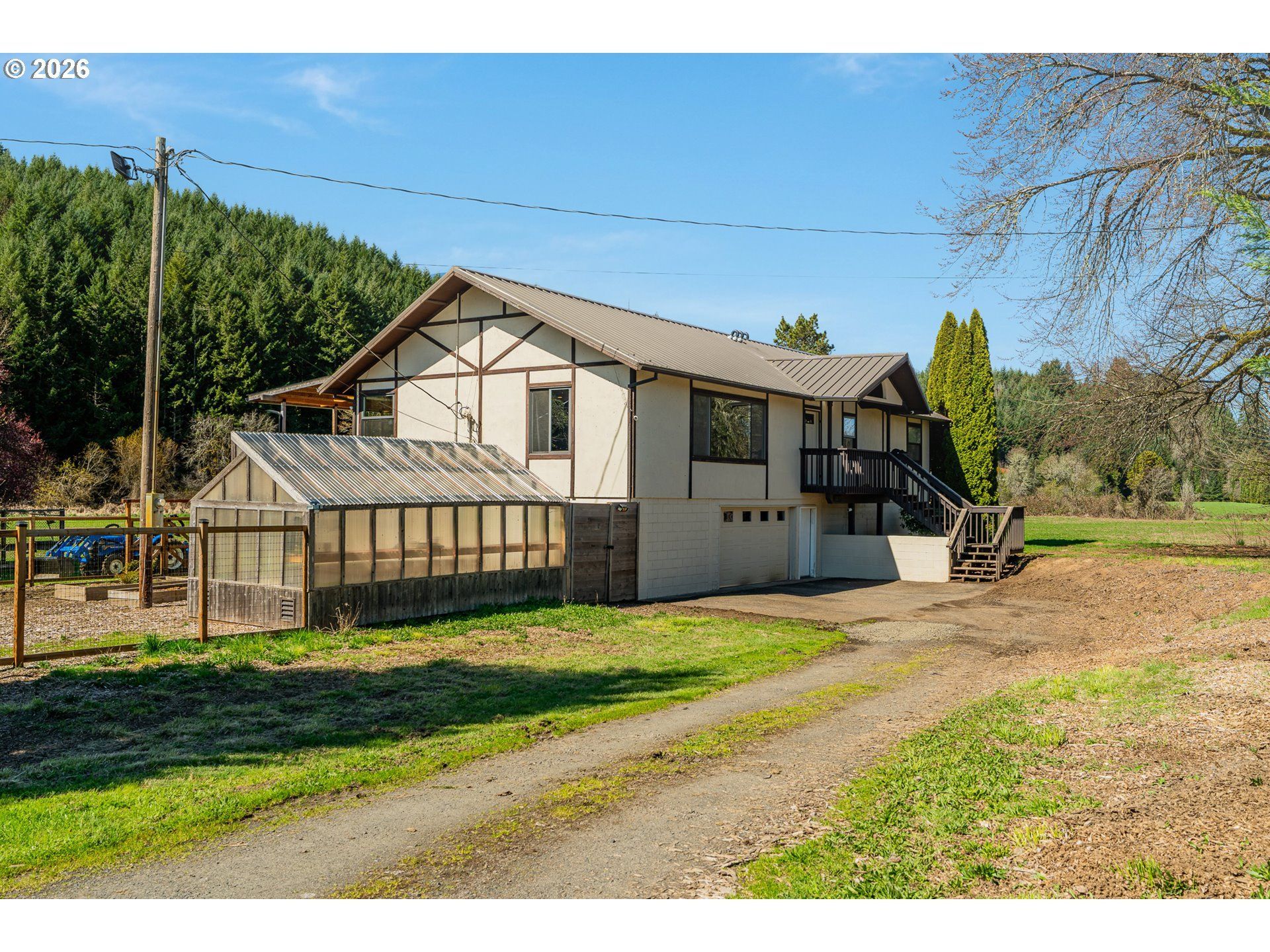Embrace the hobby farm lifestyle on this beautifully maintained 13 acre property just outside Banks, directly across from the scenic Banks-Vernonia State Trail with the future Salmonberry Trail nearby.Set up for both enjoyment and productivity, the property features an established orchard with multiple apple varieties, plum trees, and both black and English walnut trees, plus a fenced garden area and greenhouse for year-round growing. Ten acres are currently leased for alfalfa, offering passive income while the land is maintained for you.The home has been extensively updated for comfort and efficiency, including a metal roof with new sheathing, solar panels, updated windows, gutters, and a high-efficiency Carrier furnace and heat pump with air purifier. Inside, the refreshed kitchen features IKEA ash cabinets, granite counters, slate backsplash, and newer appliances. Updated flooring upstairs and a spacious covered deck (12' x 30') create inviting living spaces, while the garage includes EV charging capability.Additional features include a water treatment system, updated cedar siding and exterior paint, dual garage doors, and a Lorex security camera system. Kitchen appliances and gun safe are included.A rare opportunity to enjoy peaceful country living with room to grow, built-in income, and modern updates already in place.
