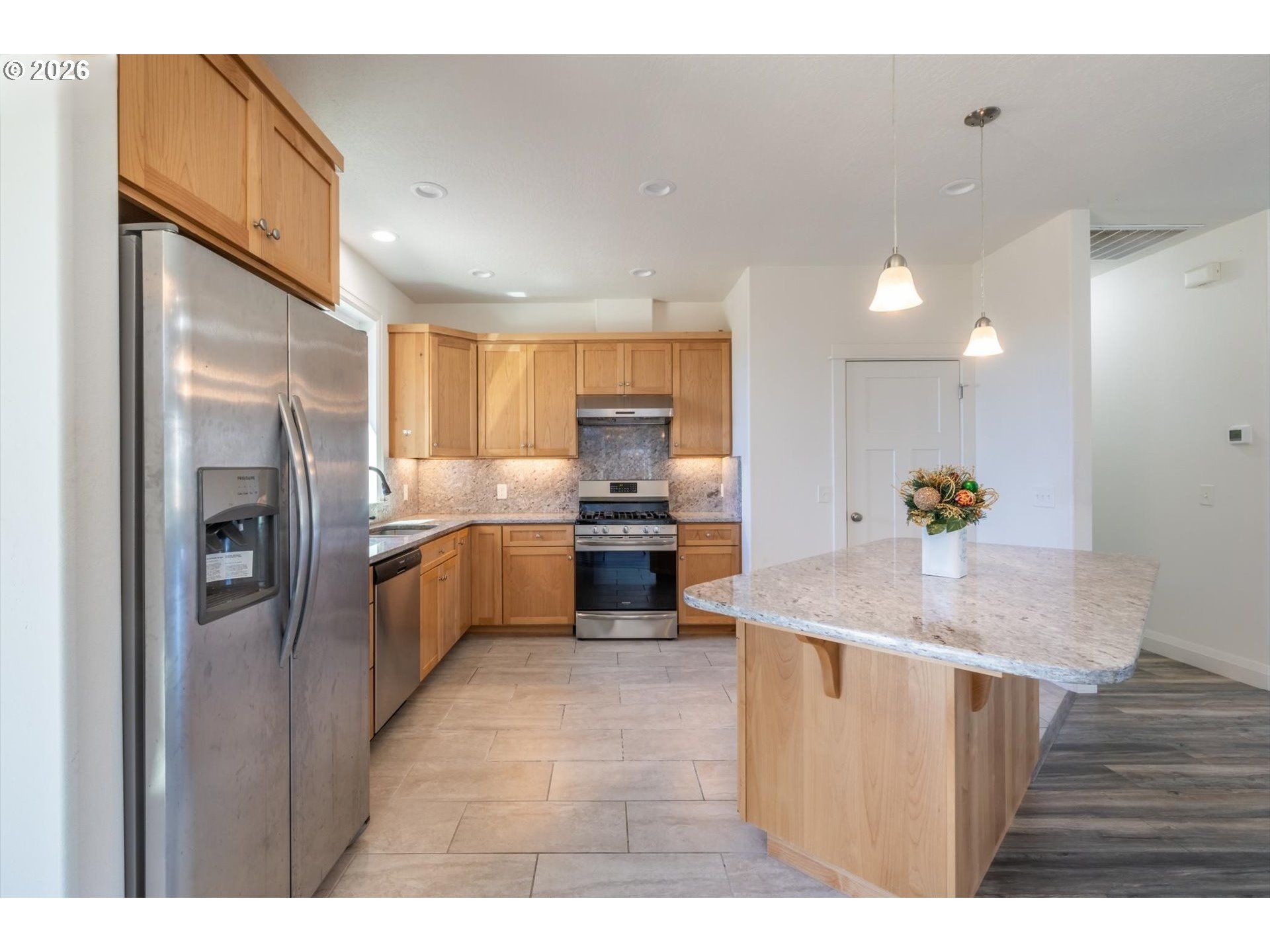 Beautifully maintained 4-bedroom, 2-bath, 1,919 sq ft home built in 2019 and ideally situated on a spacious corner lot. The open-concept layout seamlessly connects the kitchen, dining area, and living space, creating a warm and inviting setting for entertaining or everyday living. The kitchen showcases granite countertops, natural wood cabinetry, tile finishes, and a gas range. The comfortable primary suite includes a private en-suite bath, offering a relaxing retreat. A conveniently located laundry/mud room just off the garage adds everyday practicality. Outside, the low-maintenance backyard features a large, fenced area with raised garden beds, & nice patio perfect for entertaining. The side yard provides ample RV or boat parking. Ideally located near shopping, medical facilities, scenic Oregon Coast beaches, state parks, and excellent opportunities for fishing and crabbing.