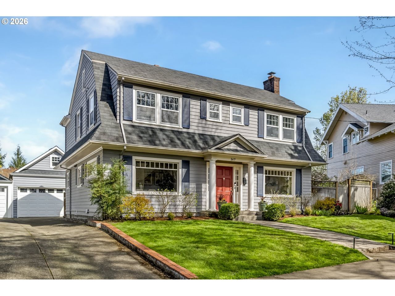Charming 1923 Dutch Colonial with a classic layout and a beautiful backyard. The main level features a spacious living room with a wood-burning fireplace, a formal dining room with lovely period details, an updated kitchen, and a convenient half bath. Upstairs, you'll find three bedrooms and a full bath, including a generous primary suite with an ensuite bathroom. The remodeled lower level offers flexible living space with a private office and a family room featuring a Murphy bed that can be closed off for guests. This level also includes a full bathroom and a dedicated laundry room, complete with a laundry chute from the top floor to the basement with access points on each level. Set on an oversized lot, the thoughtfully landscaped yard is inspired by an English garden and features two distinct outdoor entertaining areas.
