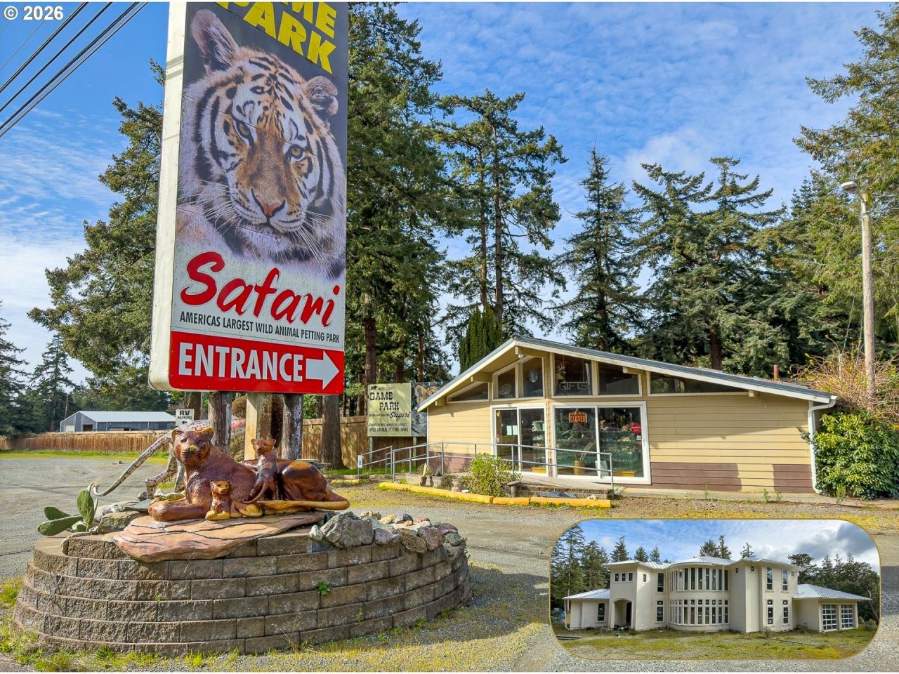 Unlock a once-in-a-lifetime commercial opportunity at the former West Coast Game Park-a legendary destination now ready for its next visionary owner. Set on 20.24 acres of C-1 commercial land with an incredible 714' of prime Highway 101 frontage, this high-visibility property offers limitless potential for a new business venture. The site features a storefront/gift shop building, an impressive custom event gazebo, multiple fenced areas, restrooms, and numerous outbuildings plus two large 40' x 60' metal shops and ample parking for dozens of vehicles with easy highway access. Included are two residences: a caretaker's double-wide home with a detached double garage located near the former business area, and on the southern portion of the property you'll find a massive 5,136-square-foot custom home with stunning stucco exterior and metal roof, currently unfinished but fully framed and ready for completion, showcasing remarkable architectural character inside and out. Positioned just minutes from world-class destinations like Bandon Dunes Golf Resort, Bandon Crossings Golf Course and only 7 miles from the vibrant coastal town of Bandon, this property presents endless possibilities for tourism, recreation, hospitality, or a visionary new enterprise. Offered at an exceptional value and sold AS-IS, this is a true once-in-a-lifetime investment for qualified cash buyers ready to bring new life and energy to an unforgettable property. Shown by appointment only.